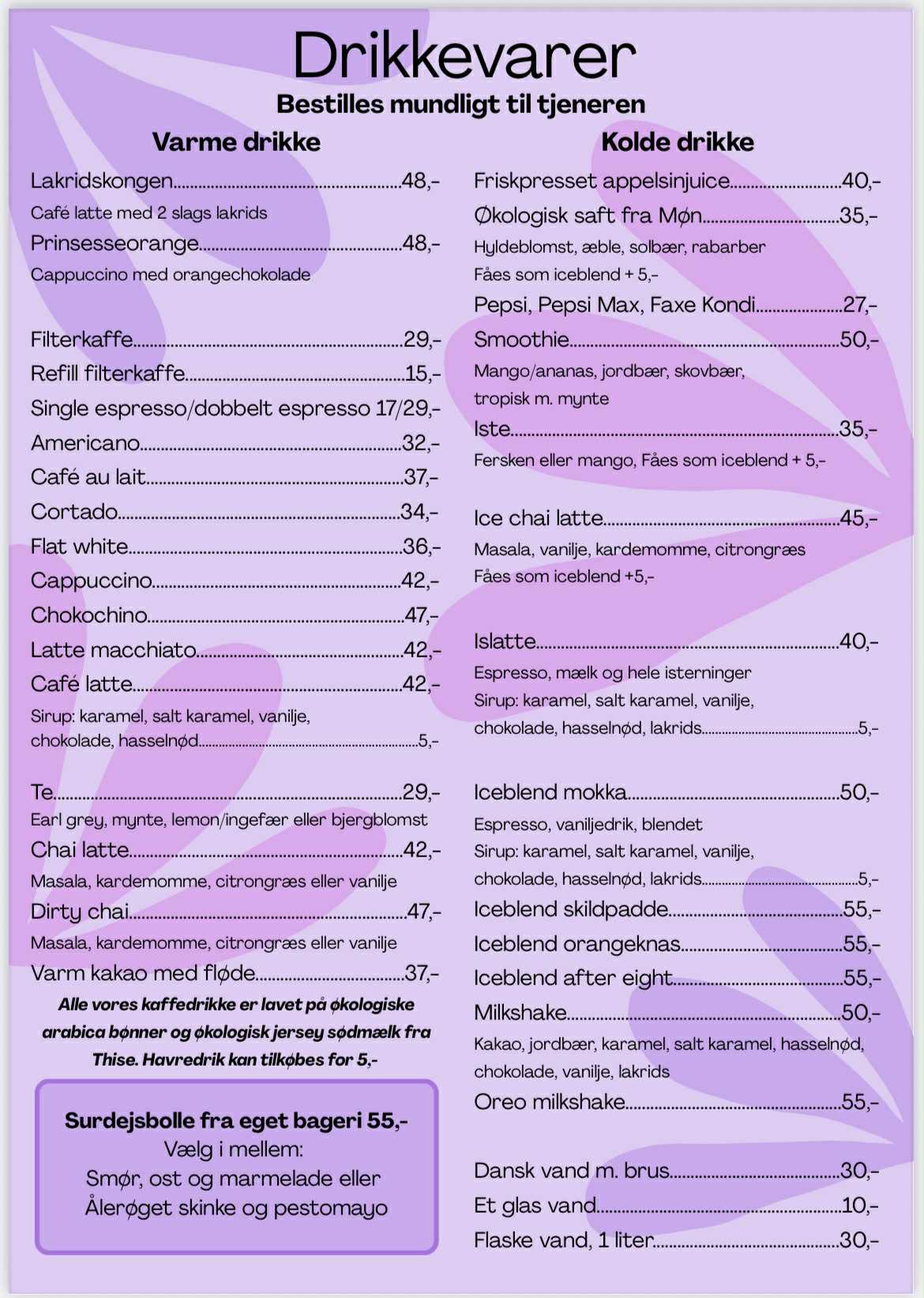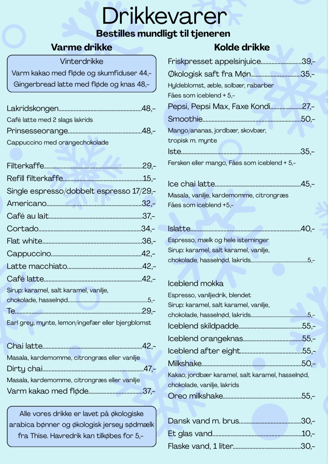 Smag vores forskellige kaffedrikke både varme og kolde. Vi bruger økologiske kaffebønner og økologisk jersey mælk fra Thise.